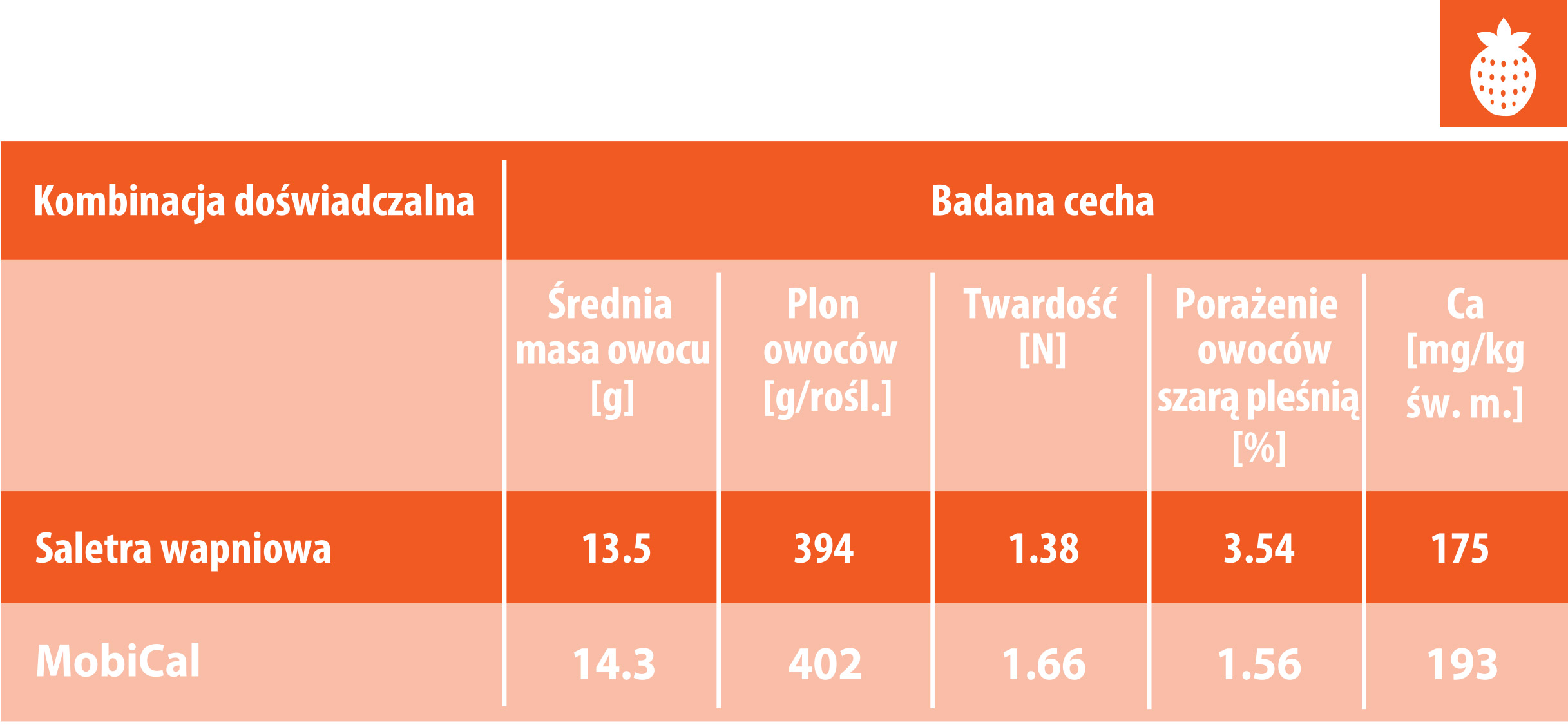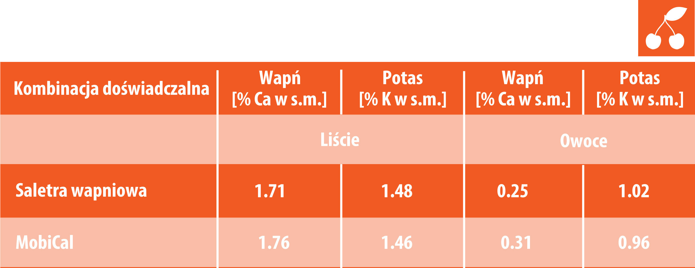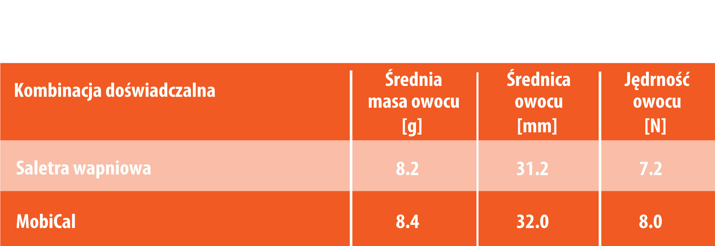 Zwiększa ochronę przed gorzką plamistością przez zobojętnienie kwasów powstałych podczas rozwoju owoców. Migracja wapnia w sercu owoców tworzy niedobory w naskórku. Technologia HSF pozwala przeciwdziałać tym objawom gwarantując doskonałą dyfuzję wapnia w całych owocach. Stosunek K / Ca (25:1) jest optymalny. Ten sam proces pomaga chronić przed chorobą gorzkiej plamistości podskórnej. Regularne aplikacje MobiCal stymulują naturalne mechanizmy ochronne roślin, które mogą zmniejszyć intensywność i częstotliwość maczniaka – oidium. Wczesne aplikacje, a następnie regularne stosowanie (co 10–15 dni), pozwalają ograniczyć zjawisko pękania wiśni i śliwek dzięki większej mobilności wapnia i wzmacniania ścian komórkowych. Wczesne zastosowanie na śliwki poprawia witalność szypułek, ograniczając w ten sposób straty niedojrzałych owoców.