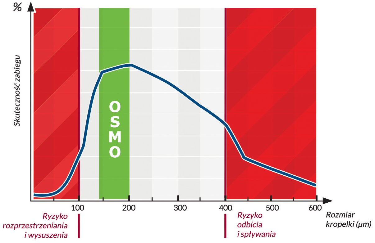 Wielkość kropelek odgrywa ważną rolę dla skuteczności zabiegu. Jeśli są one mniejsze niż 100 mikronów, będą łatwiej rozprzestrzeniać się w innym miejscu niż na uprawach lub nawet wyschną nie osiągając celu. I odwrotnie, jeśli są większe niż 400 mikronów, ich zbyt ciężka waga spowoduje odbicie kropelek nie pozostając na uprawach.