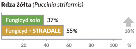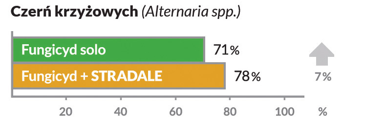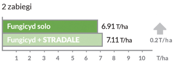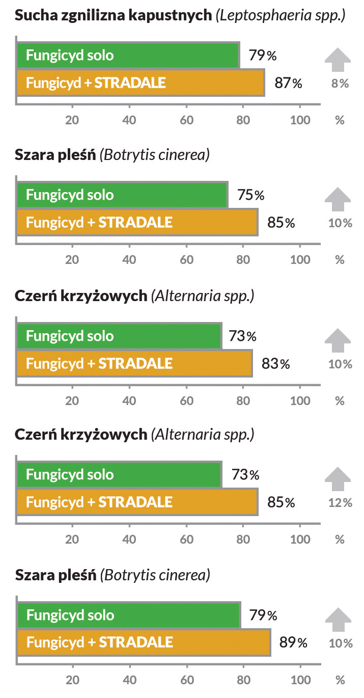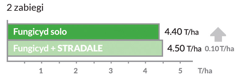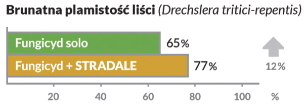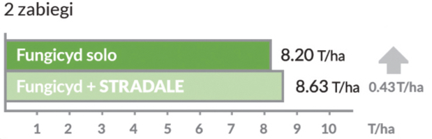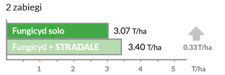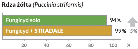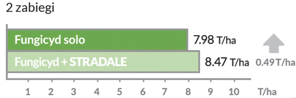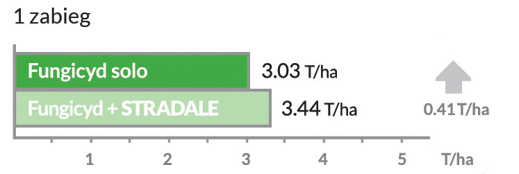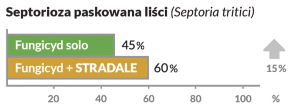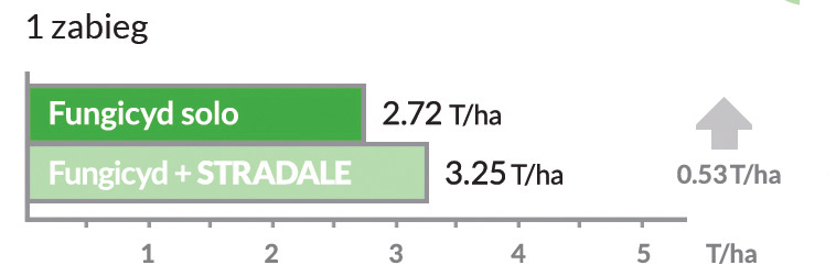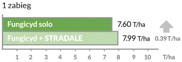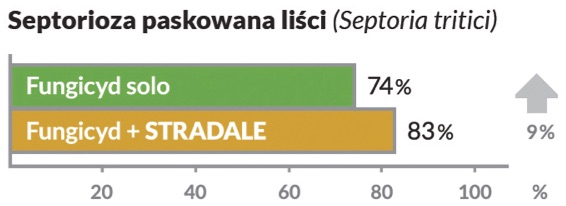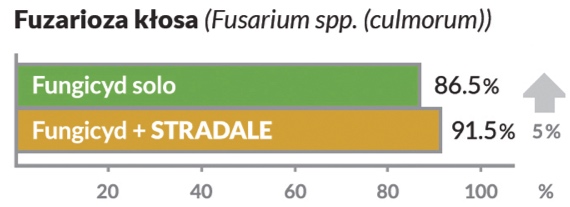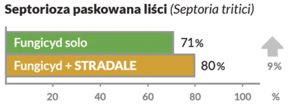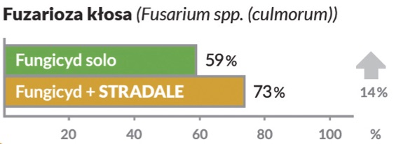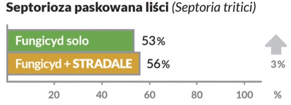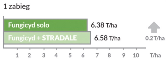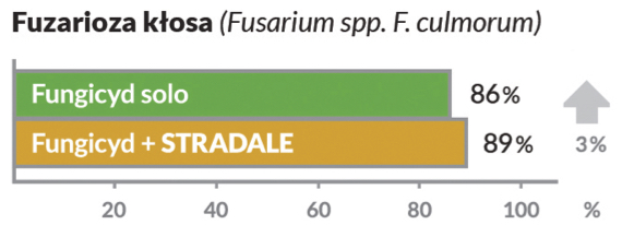 STRADALE zwiększa skuteczność zabiegów interwencyjnych (dawka fungicydu 100%), jak również zabiegów profilaktycznych (¾ dawki fungicydu).