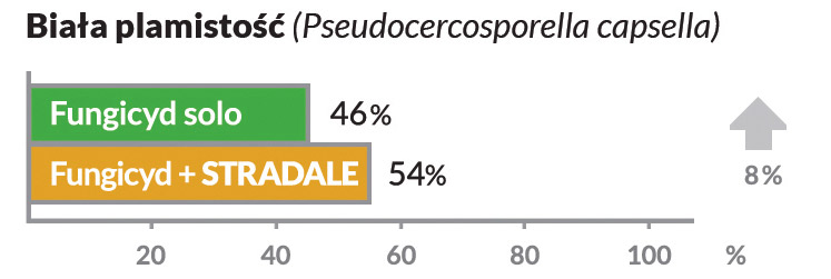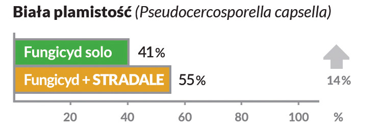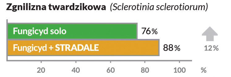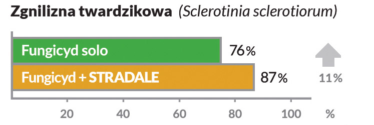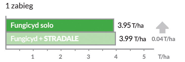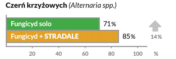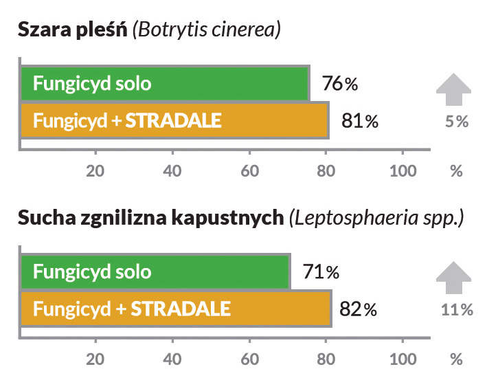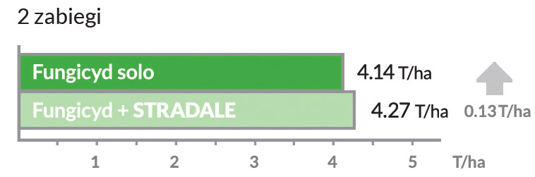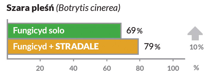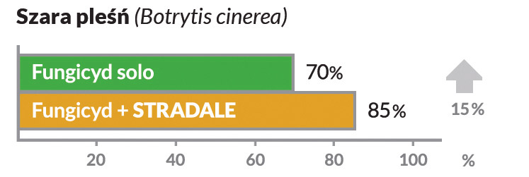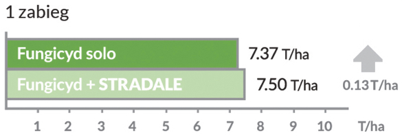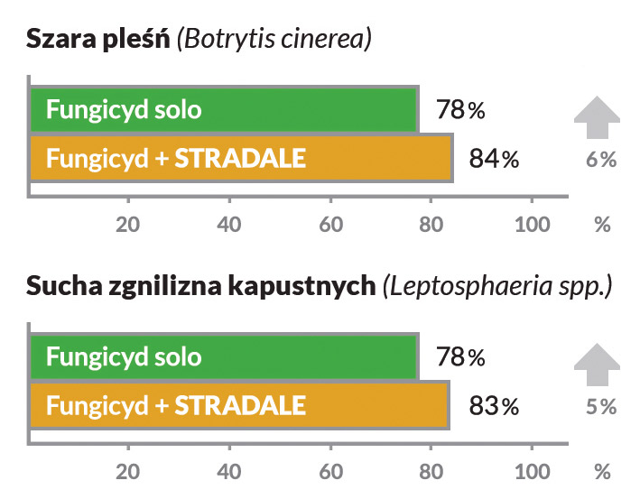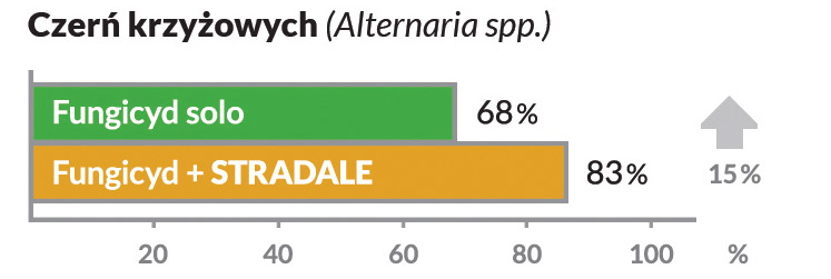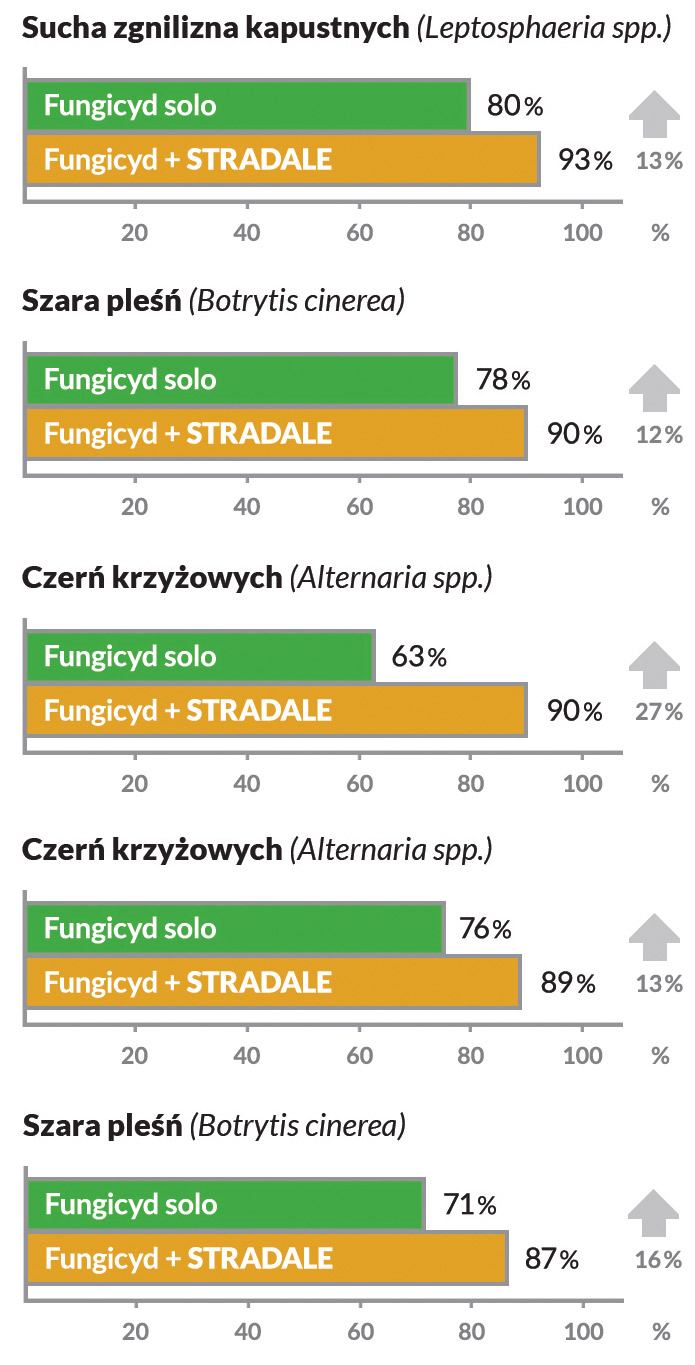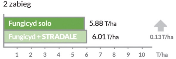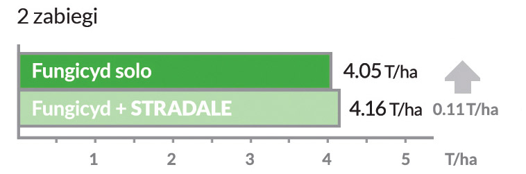 STRADALE zwiększa skuteczność zabiegów interwencyjnych (dawka fungicydu 100%), jak również zabiegów profilaktycznych (¾ dawki fungicydu).
